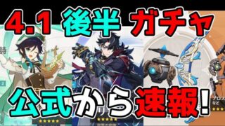 原神げんしん最新バージョンVer4.1のフォンテーヌにて、4.1後半のガチャ詳細星4などが公式から緊急発表!。リーク無し。旅人の皆さんにガチャでリネリネットフレミネ,フリーナ,鍾離(しょうり)ナヒーダ,ニィロウ,白朮,カーヴェ(かみさとあやか)申鶴(しんかく)アルハイゼン,夜蘭(イェラン)胡桃(フータオ)ディシア,ミカ。魈(しょう)雷電将軍,神里綾人,スカラマシュ,放浪者,セノ,ティナリ,八重,タルタリヤ,甘雨(かんう)万葉(カズハ)ウェンティ,珊瑚宮心海(サンゴノミヤココミ)アルベド,エウルアとが出ますように。他の動画などでは世界任務アチーブメント豪華な宝箱原石モラ育成素材天賦突破素材貴重な宝箱冒険経験値聖遺物評判経験値などの入手方法などもご紹介しています。このチャンネルではリーク画像や情報を扱っていません。考察情報なども公式情報を元に楽しむ内容となっています。